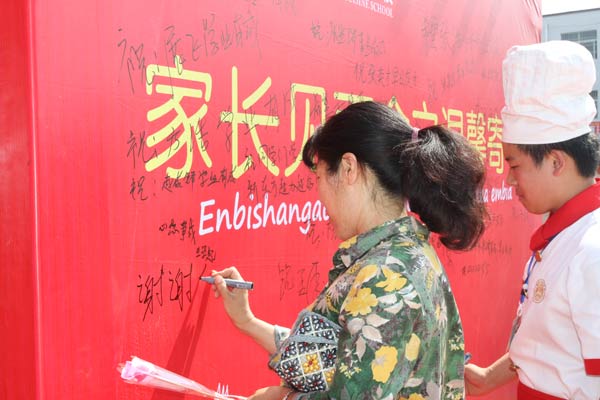 既定的时间为早上九点到九点半家长到校,有一些学生的家长早早来到了学校。到学校后的家长,到签到处签到,并领取了学校准备的精美礼品,然后到学校特意制作的寄语墙上签名,写下对自己孩子的祝福和期望。每一位家长站在寄语墙旁书写的时候,脸上都带着那难以掩饰的高兴以及对孩子们的殷切期望。