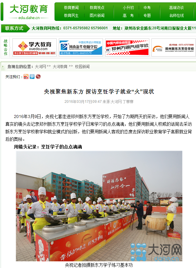 2016年3月9日,央视七套走进郑州新东方烹饪学校,开始了为期两天的采访,他们要用新闻人真实的镜头去记录郑州新东方烹饪学校学子日常学习的点点滴滴,他们要用新闻人的话筒去采访新东方烹饪学校教学和就业模式的创新,他们要用新闻人客观的态度去探访职业教育学子 好待遇就业背后的奥秘。