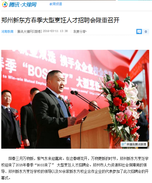 阳春三月万物新,紫气东来迎嘉宾。在这春暖花开,万物更新的时节,郑州新东方烹饪学校迎来了2016年春季“BOSS来了” 大型烹饪人才招聘会。郑州市人力资源和社会保障局的领导、郑州新东方烹饪学校的领导以及50余家新东方校企合作企业的代表参加了此次招聘会的开幕式。