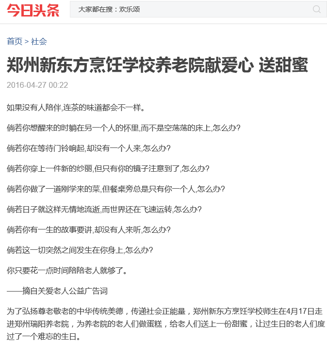 为了弘扬尊老敬老的中华传统美德,传递社会正能量,郑州新东方烹饪学校师生在4月17日走进郑州瑞阳养老院,为养老院的老人们做蛋糕,给老人们送上一份甜蜜,让过生日的老人们度过了一个难忘的生日。