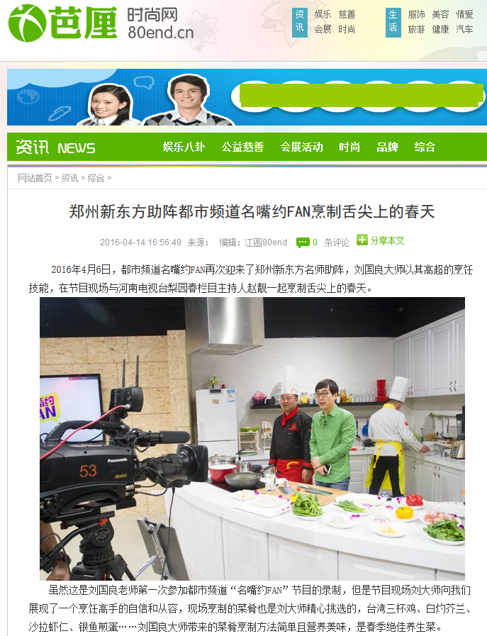 2016年4月6日,都市频道名嘴约FAN再次迎来了郑州新东方教师助阵,刘国良教师以其高超的烹饪技能,在节目现场与河南电视台梨园春栏目主持人赵靓一起烹制舌尖上的春天。