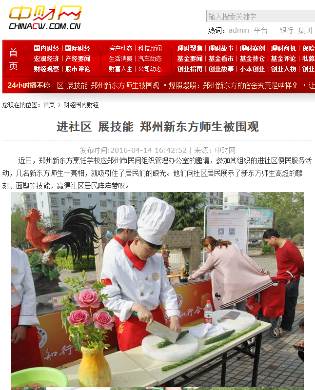 近日,郑州新东方烹饪学校应郑州市民间组织管理办公室的邀请,参加其组织的进社区便民服务活动,几名新东方师生一亮相,就吸引住了居民们的眼光。他们向社区居民展示了新东方师生高超的雕刻、面塑等技能,赢得社区居民阵阵赞叹。