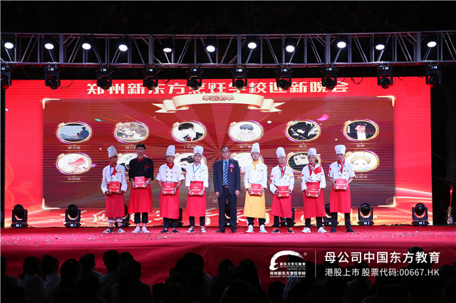 借着今日喜庆的晚会氛围,第七届“新东方杯”烹饪技能大赛获奖班级代表和个人也在舞台亮相,学院路校区总务处负责人李主任和学院路教务处负责人王主任分别为获得银奖的班级和个人颁奖。