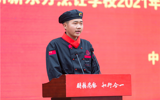 我校学生代表上台发言,他表示自己很荣幸在青春迷茫期选择郑州新东方烹饪学校这个大家庭,并相信在师资力量雄厚且教学水平高的郑州新东方一定会培养出更多的出彩学子。