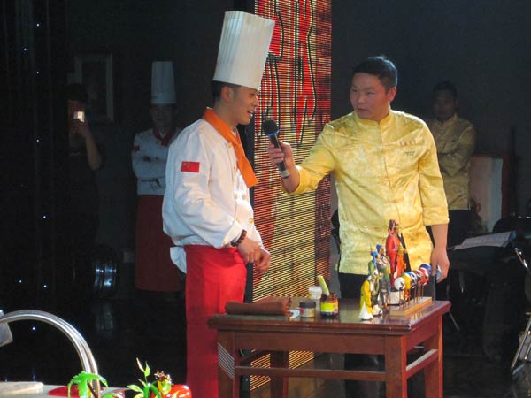 新东方烹饪教师李彦浩也不甘示弱,他将中国传统书法和食材结合,别出心裁地为大家现场展示了用大葱撰写书法作品,笔力劲挺,气势磅礴,引得现场观众阵阵惊叹。