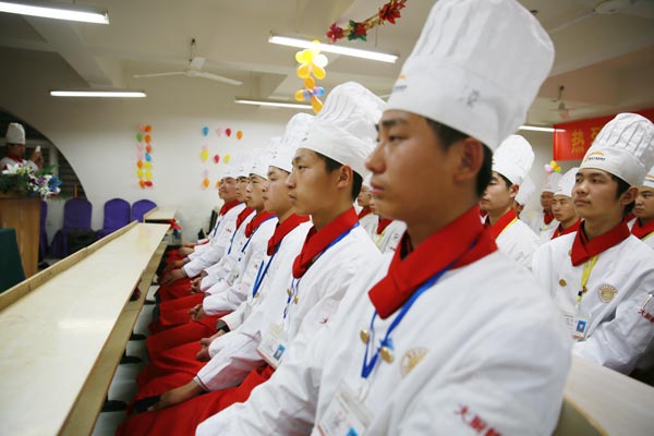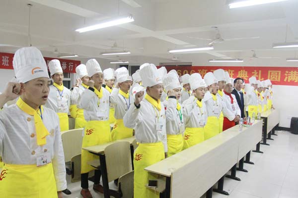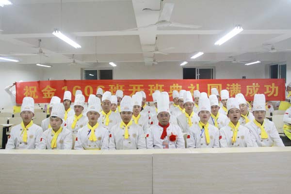 典礼上,他们奏响庄严肃穆的国歌,全体人员举行了奏国歌仪式。并起立宣誓,热爱烹饪事业,弘扬饮食文化;尊师重道守纪,恪守诚信公德;维护食品安全,倡导勤俭节约;立一等品格,练一等技能,为做一名德艺双馨的厨师而奋斗!