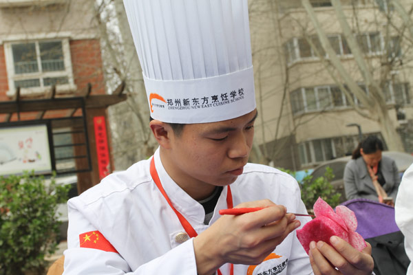 近日,郑州管城区一社区的居民迎来了几位特殊的客人——郑州新东方烹饪学校的几教师生,他们一亮相,就吸引住了居民们的眼光。他们向社区居民展示了新东方师生高超的雕刻、面塑等技能,赢得社区居民阵阵赞叹。