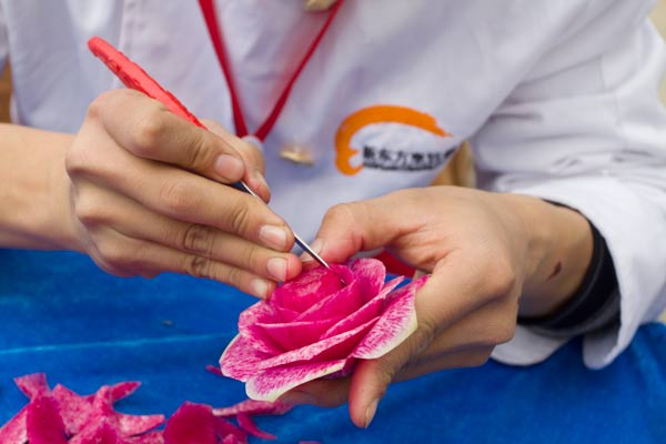身着厨师服,手拿雕刻刀,郑州新东方烹饪学校的几教师生一亮相,就吸引了现场居民的围观。据悉,郑州新东方烹饪学校是应郑州市民间组织管理办公室邀请参加其组织的进社区便民服务活动,作为文化活动的一个环节进行社区居民互动和技能展示,他们现场展示了西瓜雕刻,花朵雕刻,动植物雕刻等多种雕刻技能,还展示了中国传统的面塑技能。新东方师生们的作品都栩栩如生,惟妙惟肖,引起现场居民的围观和关注,他们纷纷为新东方师生竖起了大拇指。当一些老人和孩子收到新东方的作品作为礼物时,他们脸上露出了灿烂的笑容。