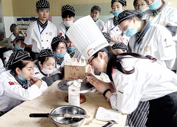 讲桌上放着老师裱好的样品,时不时有学生上前观摩。有的学生不停地按照样品的纹路练习着手法,有的学生则低声询问着老师一些细节问题,"这个腿的姿势应该怎么裱?脸部应该按什么顺序画?牛角用圆花嘴裱还是细裱嘴裱?"。面对这些问题,班主任霍老师总会耐心地一一指点,有时会将重点难点再演示一遍,大部分学生会再次仔细观看。