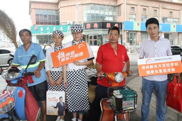 2016年8月11日,天气闷热难耐。郑州新东方烹饪学校老师一大早就在学校实训教室里熬制绿豆汤,满满一大锅,精心熬制,然后放在冰箱里冰镇起来,这些由新东方师生精心准备的绿豆汤是为了给在烈日下仍然坚持在工作一线的人们准备的,10点整,满载着新东方师生爱心的车辆缓缓驶出学校,开始了一场爱心之旅。