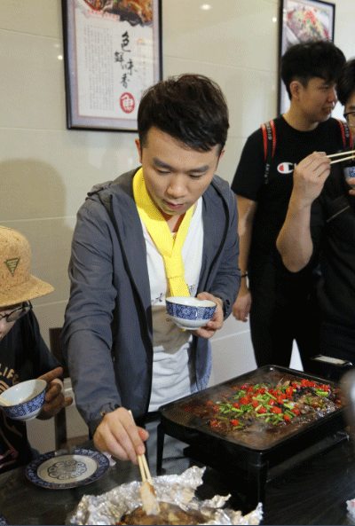 图:卢正雨在“烤鱼教室”品尝徽州特色美食臭鳜鱼后大赞其美味