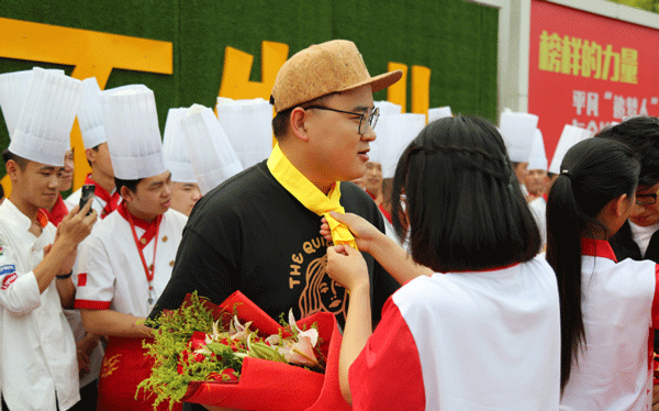 图:新东方学生为三位明星佩戴金领大厨黄领巾