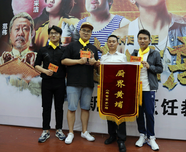 图:新东方烹饪学院马晓亮和陶东两位老师将亲手制作的面毛裤赠予主创团队并祝影片大卖