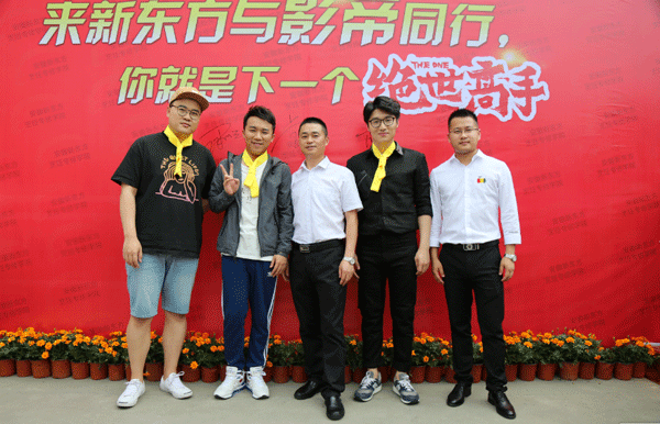 图:三位明星在“新东方&绝世高手”签名墙上签名并与新东方领导合影留恋