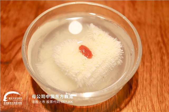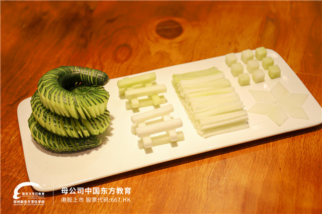 只听主持人一声令下,郑州新东方小厨师们齐刷刷的切菜声随之传来。他们手握菜刀,娴熟地切起来,不一会儿,刀工作品就呈现在了眼前。