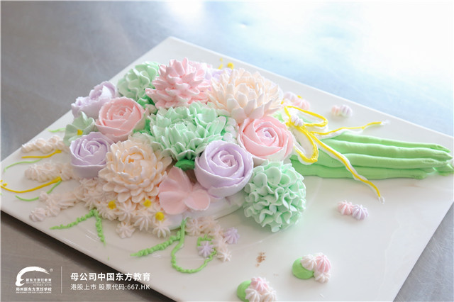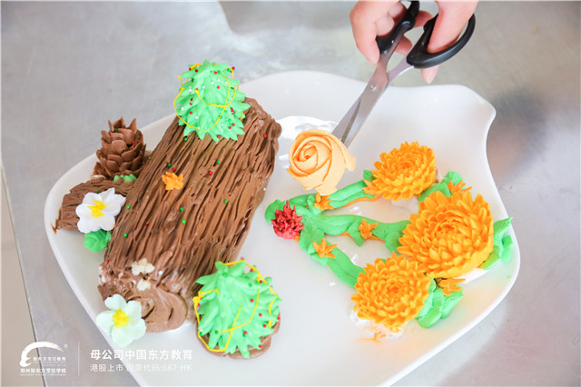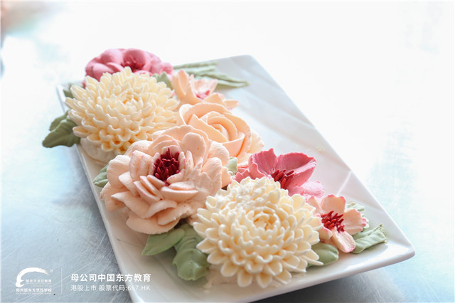 瞧!同学们在转动的裱花盘上,熟练地构造着各式造型,手中的奶油不一会儿就乖乖变成了一朵朵形态各异的花,绽放开来。新东方学子们用他们精湛的技艺,制作了各式各样、五彩缤纷的蛋糕裱花作品,可见同学们扎实的基本功底,在平时训练中一定非常努力!
