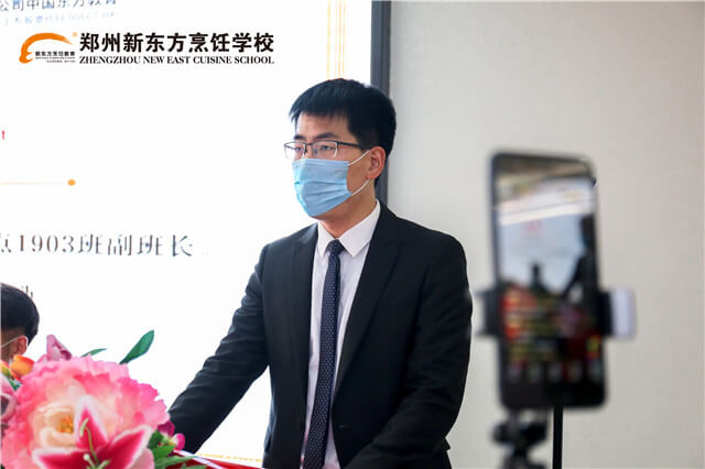 我校班干部代表金典总厨1912班高同学进行线上发言。他表示非常荣幸作为代表进行发言,对新同学表示热烈的欢迎,对全体教师致以衷心的感谢和祝福,并表达对郑州新东方烹饪学校的感激之情。他激动万分地与大家分享到,在郑州新东方烹饪学校他不仅树立自信心,提升自我价值,还收获了真挚的友谊;漫漫人生路,遭遇挫折在所难免,在接下来的学习中,定会再接再厉、奋发向上,以崭新的面貌迎接新的征程。